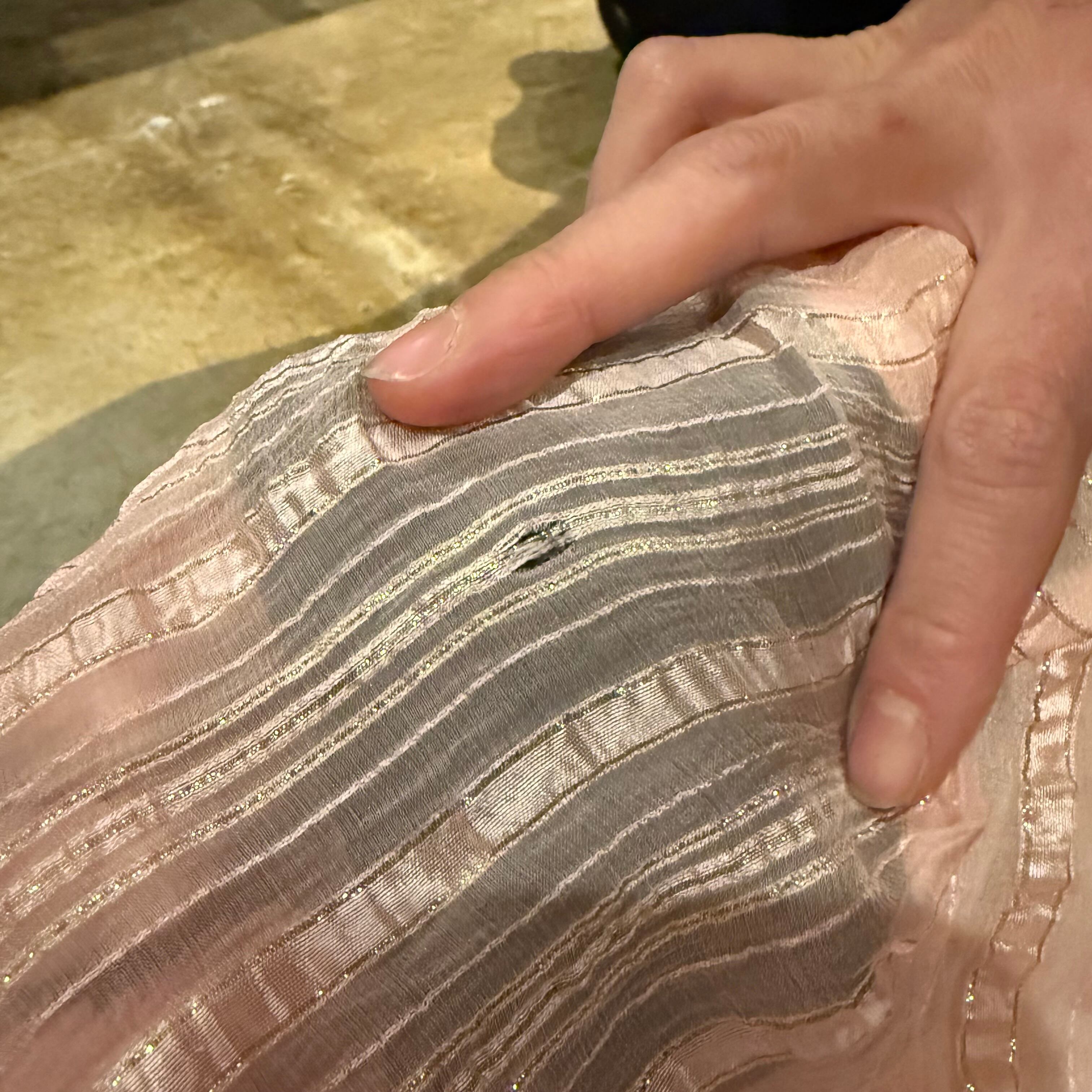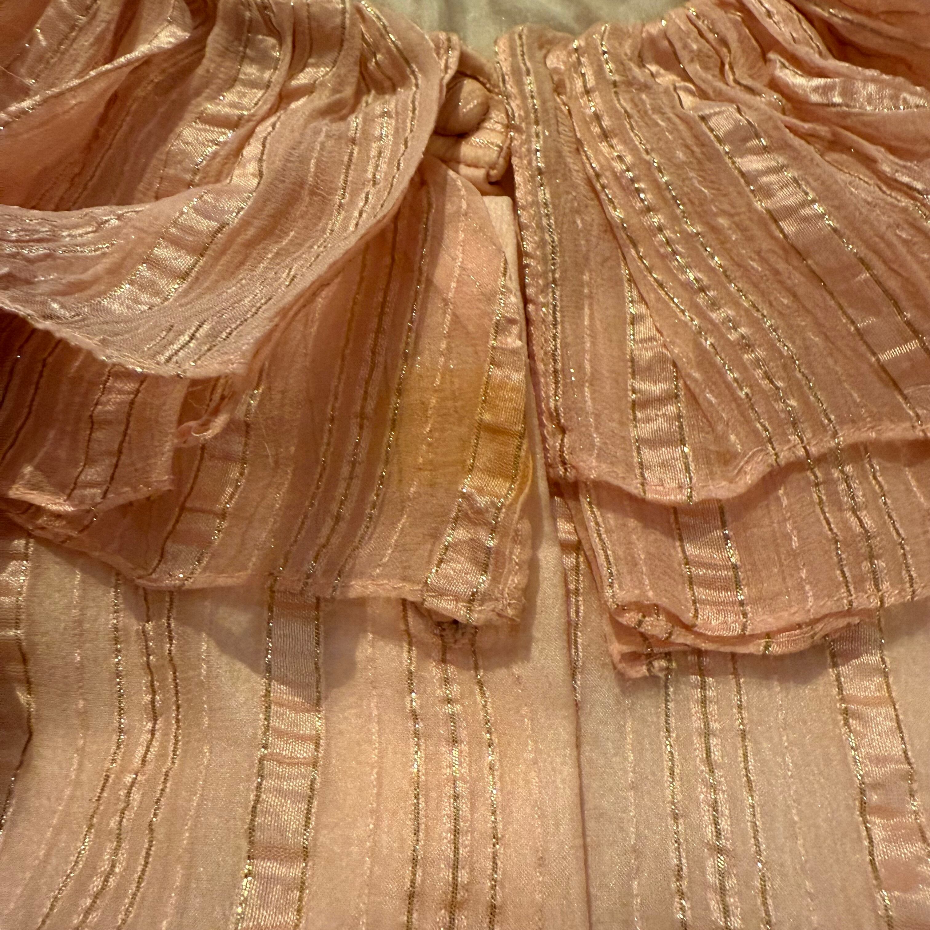 ラメ入りの糸が入る生地や淡いピンクカラーがポイントとなり、フリルでボリュームのある襟が可愛いブラウスです。